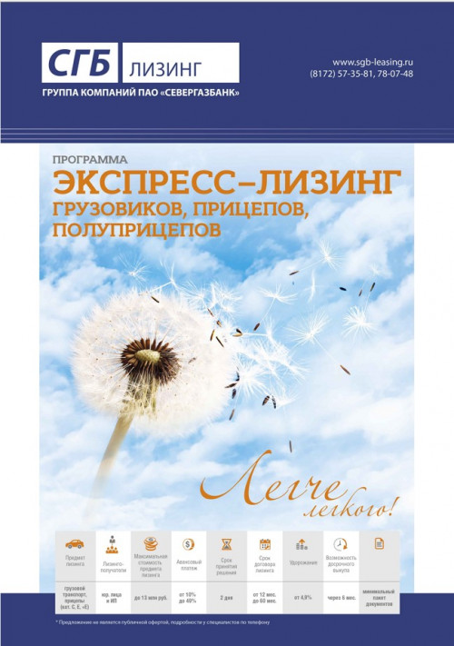 Компания «СГБ-лизинг» внедрила новую экспресс - программу по лизингу грузовиков, прицепов, полуприцепов, существенно улучшив условия для клиентов.