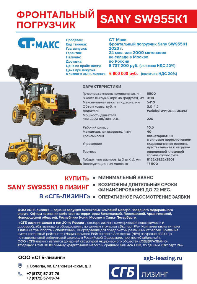 Скидка на покупку фронтального погрузчика SANY SW955 K1