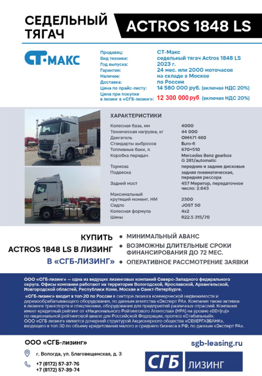 Скидка на покупку седельного тягача ACTROS 1848 LS