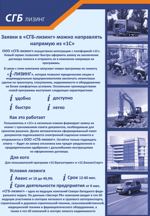 ООО «СГБ-лизинг» осуществило интеграцию с платформой «1С». Новый сервис «СГБ-лизинг» позволяет быстро оформить заявку на заключение договора лизинга и отправить ее в компанию напрямую из программы.